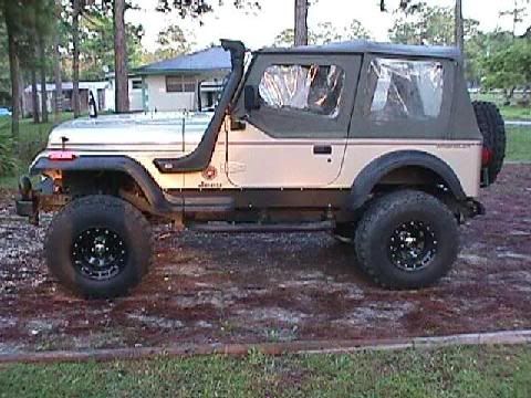 this is a pic of my wife's (Cat) 93 YJ it has a BDS 3.5 spring lift, 3" body lift, arb snorkel, 33x12.5 swamper radials on 15x10 black pacer (fake bead locks), 6" besttop flares, stage 1 performance chip, rhino on the inside, and soon to be swing out tire carrier.