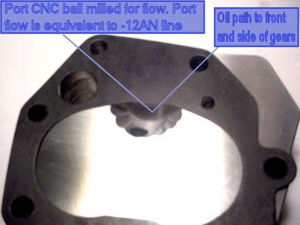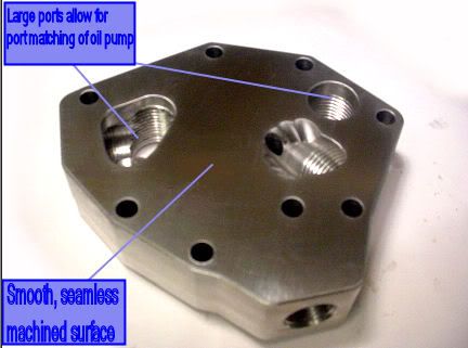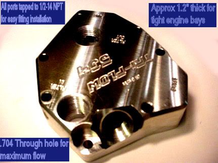 #534 Tri-flow for AMC V8's replaces all dry sump pickups and allows the pickup tube (in the oil pan) hole to be plugged. Oil can be picked up by means of oil pan sump or other. No tapping of the block is needed (with single line) and this adaptor has provisions for running external coolers, oil filters, oil prelubers or/and oil volume meters or pressure sensors and it replaces entire oil filter adaptor. #534 comes with all holes premarked for easy plumbing.