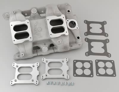 jeep_man_401 I am running the same intake on my Jeep with 2 X 600 Eldbrocks. I have some spacers I used before, but they were for going to a spreadbore pattern. The spaces in the pic should have cam with the intake. Mr. Gasket makes all sorts of spacers and adaptors. But I would shy away from short adaptors (like I had) as the mess with the intake flow.