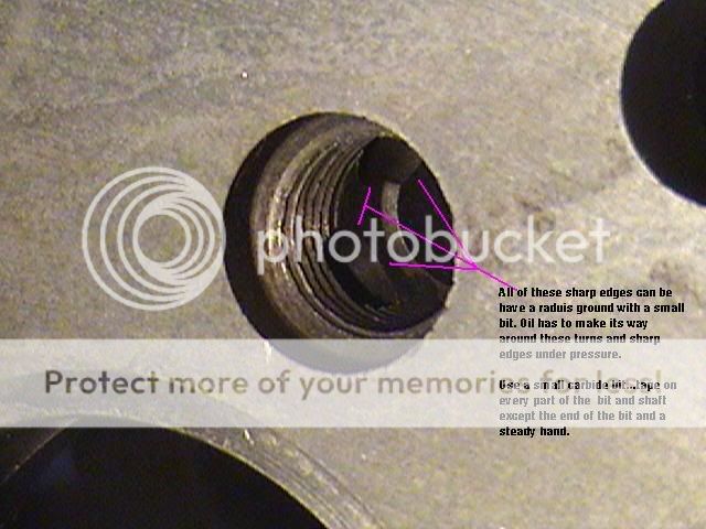 The front of the block in the valley with the 2 plugs should have all the sharp edge raduis with a die grinder.