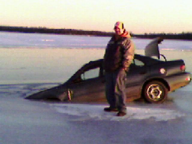 I sold a car to a buddy and he let another buddy use it without changing the title. Sherriff called and said their had been a accident and the car will be getting towed. Here he is attempting to ice fish from his car door on Millacs lake in MN.
