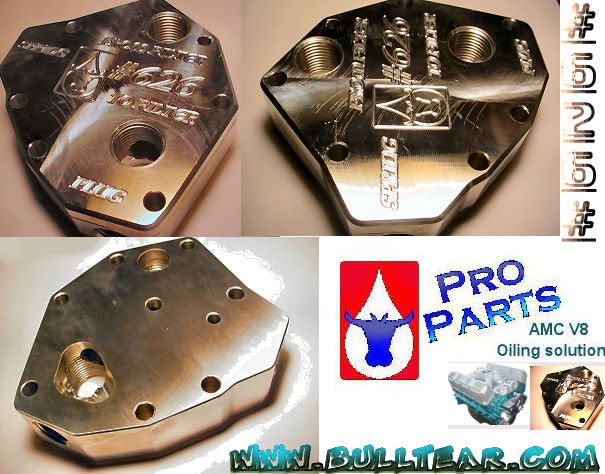 "626 replaces the oil filter adaptor and does away with the oil filter bypass while retaining the pressure bypass spring and plunger. This plate has generous .704" through hole for maximum oil flow to and from remote oil filter adaptors, oil coolers...ect. Tapped to a 1/2-14 NPT on the "in" and "out" of the plate. Fits all AMC 67-91 and we also offer this in kit form with hose, fittings and remote oil filter adaptor (we also offer dual filter adaptors and oil coolers, see store for details).