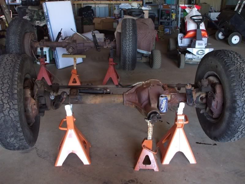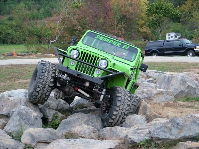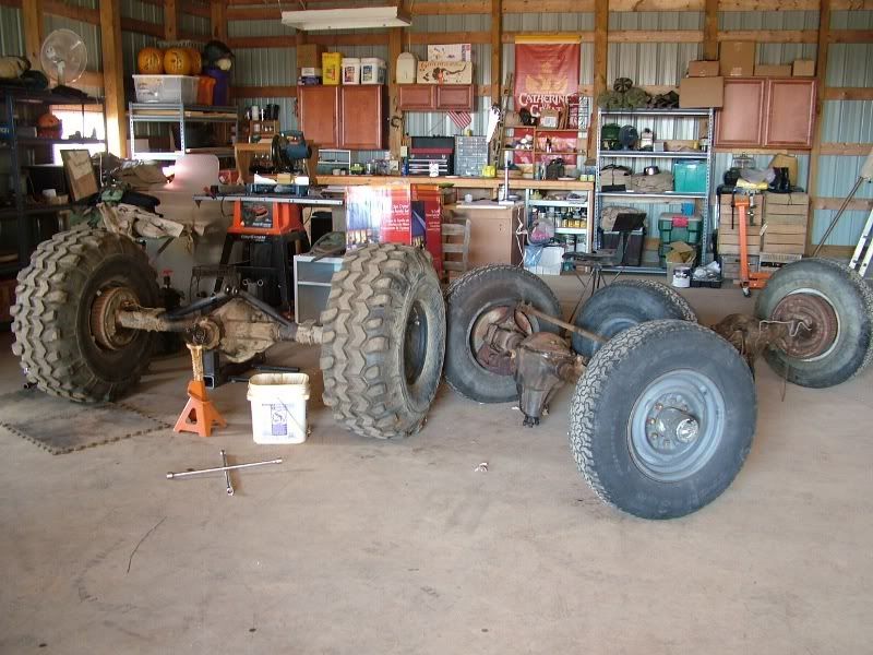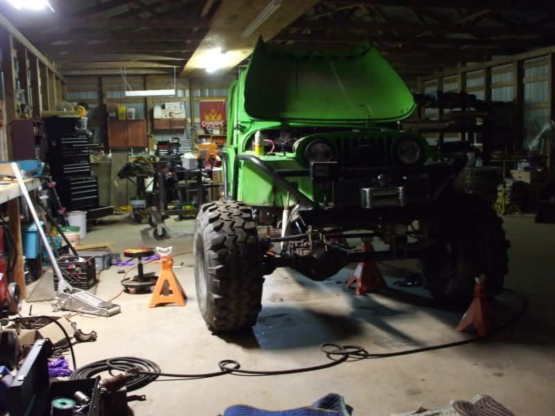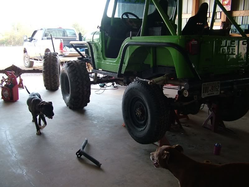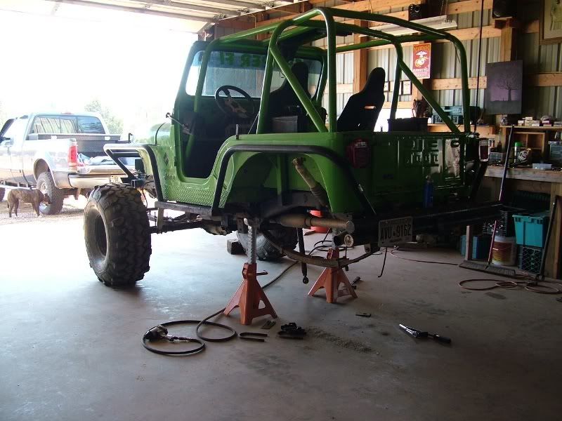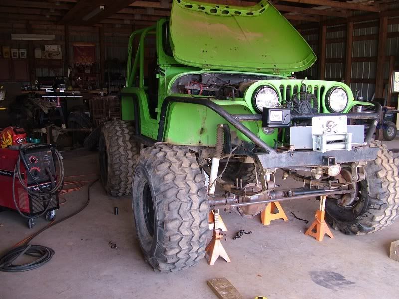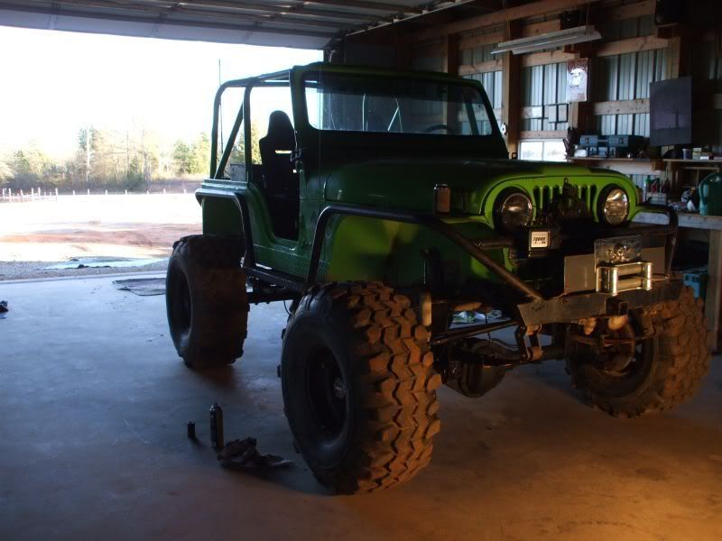 cj5 buggy Soooo MC & Mud... ya'll ready for April? :razz: i know ya'll like Pics... before swap... 383 stroker, th350, D300... 14 bolt 4.10's detroit, Front was a Scout D44 with ford 8-lug outers... held up okay, until i got up here in GA and started with the rock crawling, and lack of grease... dana 44 started going pop .. so time for 60/14 bolt combo... the shop... axels... 60/14 out of a CUCV 4.56's and detroit in the rear. out with the old... in with the new... can't for get about the hounds.... then starting on the front, then where the track bar was welded to the frame, rust = time to repair... the fronts is in at least... WFO highsteer you can see the frame repair in this pic... yep i had to get my own heat... man is she Fat clears the shock... rear disks... they're just thier for mockup... i still need to tear them down and paint... :mrgreen: our other vehicles... the wifes 93 YJ... the pick'em up trucks... 55 and 57. ones is going to be her flatbed truck for tooling around here, the other will have rockwells and who knows what... our golfcart... the 49 flatty (my personal favorite) never finished right? but she's ready for a trail ride... definatley need a front locker, and time to get the propane on... Dutches... Jason's pooch... and mr. wrinkles... the welding table that we built... finishing the shocks... me my buddy jason mounts made room testing painted the axles... finished couple vids... ordered a lockrite for the front and going to bleed the brakes a couple more times and should be good to go. hopefully will get the propane running soon also. :mrgreen: