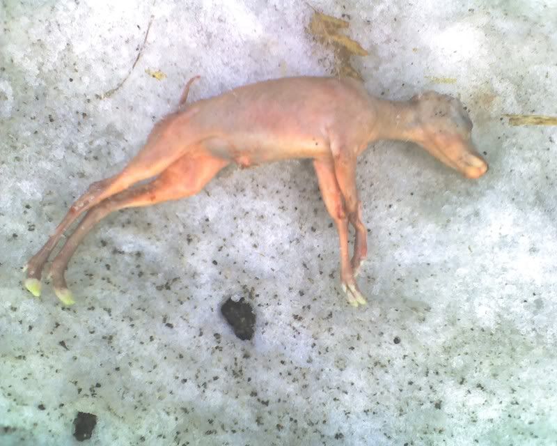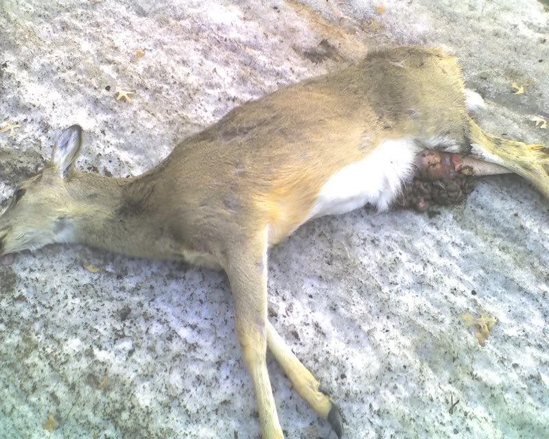 He pretty much gutted the deer. He said the deer didnt even make it to the shoulder and died right there. He jumpedout of his car to asess the damage and to his disbelief he had killed the doe immediately. He saw something small and pink about 30 feet away and investigated the sight. He saw this