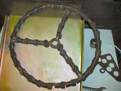The Rambler mentality has evolved from I will only pay a few cents and resell it for hundreds to .."Can I get the right parts please for free". In light of this new Rambler mentality we are now offering a one off steering wheel made from the best of the worst in AMC replacement distributor gears. These gears mainly come from China but were guaranteed to work in any AMC V8. Every single gear welded on this wheel and there are 39 of them are way to hard and would have grenaded every single engine they were put into. This hand crafted 'piece' is one of a kind.