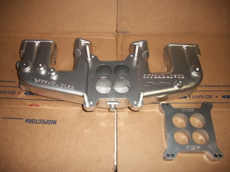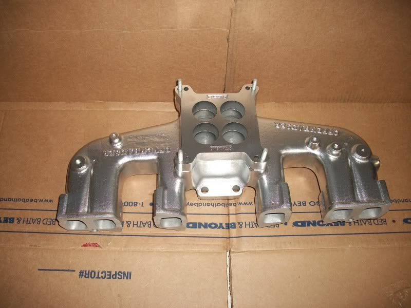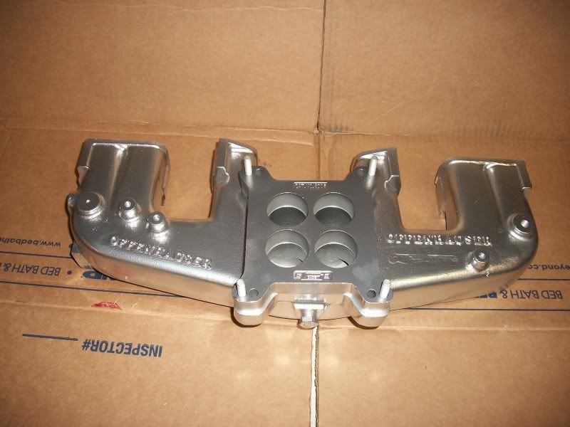 Here is a super sweet Offy dual-port intake for the AMC inline sixes. It was supposedly new and has been in storage for a long time. I bead-blasted it tonight and powdercoated it in Mirror Chrome. It also comes with a 1" aluminum 4-hole carb spacer & long carb studs.
