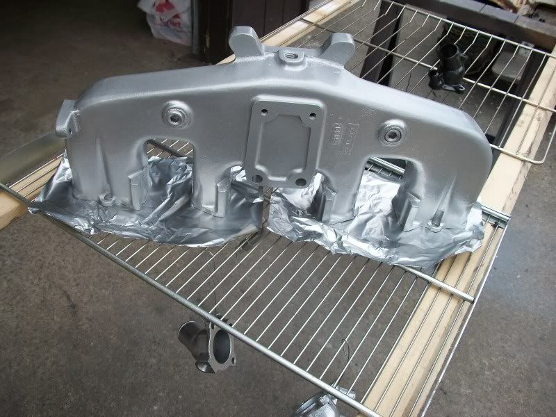 This is a new intake, that was intended for a CJ project that never happened. It had been painted black, so I glass bead-blasted it today and powdercoated it in Chrome, then powdercoated it with a clearcoat.