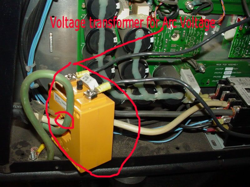 "2. The current transformer for arc ok is hooked up like this. You may need to loosen the power cable coming in to your 101. One leg of the 220 line goes through the center of the current transformer. The current transformer utilizes a resistor on top between terminals and it will come with one. The resistor has long metal legs you wrap around the current transformer and on each end you also include one lead to the arc ok terminals on the DTHC card. These terminals on your card will have little screws fro tightening."
