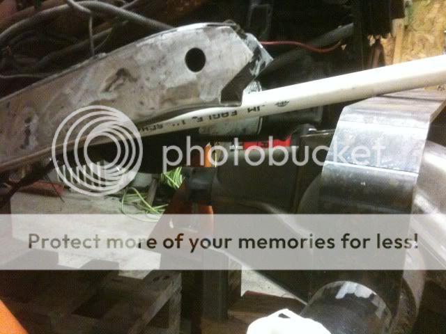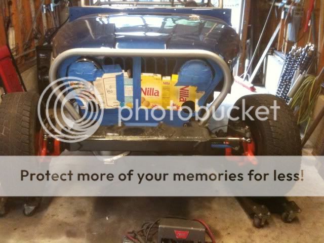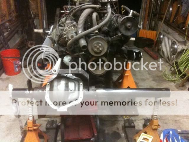 I also wanted to start some early measurements on the front end. It's tight in there with that big AMC. I'm going to investigate an oil filter relocation kit that bulltear.com is producing. That should give an acceptable amount of room. We're still looking about 106" WB, but it may push out to 107" to clear the crank pulley.