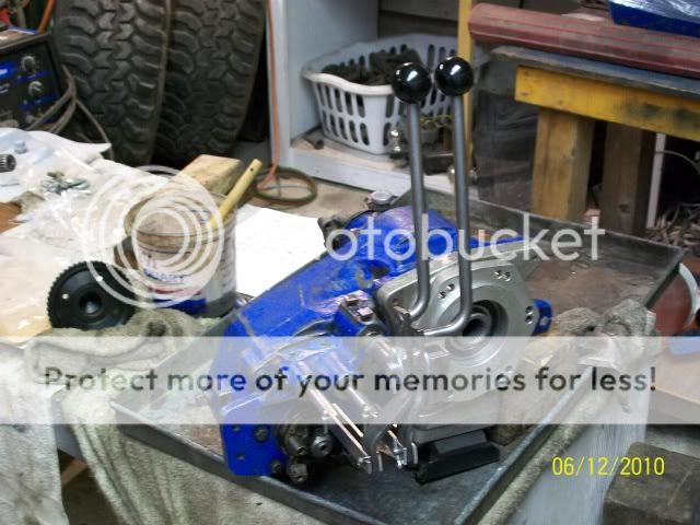 Mock up of twin stick (maybe could use one more washer but I have to think about it), I tried the bushing as per the write up on this forum but it seemed to go easier w/washers. I also used the old pins for the shift rails as the others were short calling for a 3/4" (really needs to be about 1 1/4"-1 1/2"Max by the time you get the washer/loc-washer/nut on etc.) I will not bend the shifter itself until the tub is on & I see where I want it. I did have to open the hole where the pins go on the flat-stock as they were tight. If you used the flat-stock dimensions (I recommend you do) you will need a Dremel to fine tune it but you will be happy with the results.