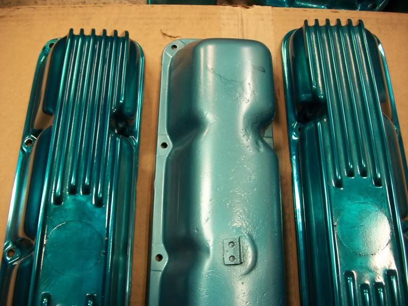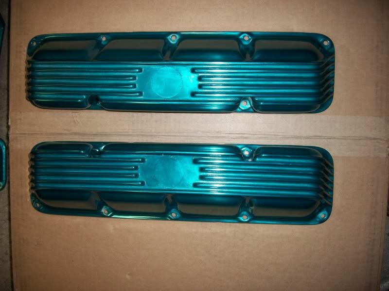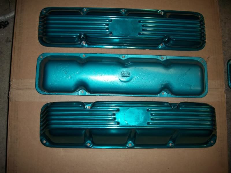 Hey guys,These are a new set of Omix Ada polished valve covers, which I purchased new from Winona Chrysler. They have been powdercoated with Translucent Teal, which is close to AMC EN66 metallic blue engine paint. I have put a stock valve cover in the pic for comparison ... the teal is a little darker with more gloss.