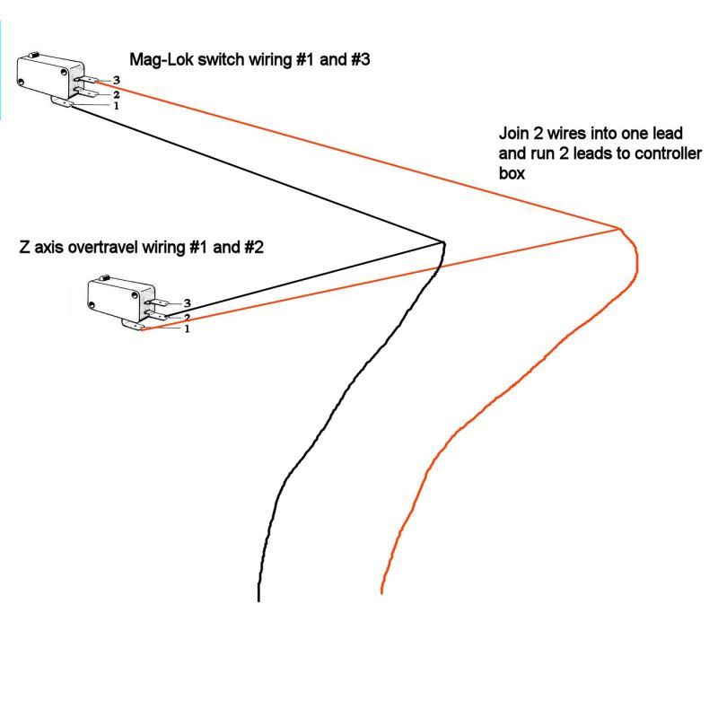 Now you can wire one lead from the Lower Z limit switch to one lead of the Mag-Lok switch together. Then wire the other side together to form 2 pairs. These will be wired inside the control box to the X axis home terminals via 2 spade connectors. The Z HOME is the switch wired from the factory that will go to the Z home.